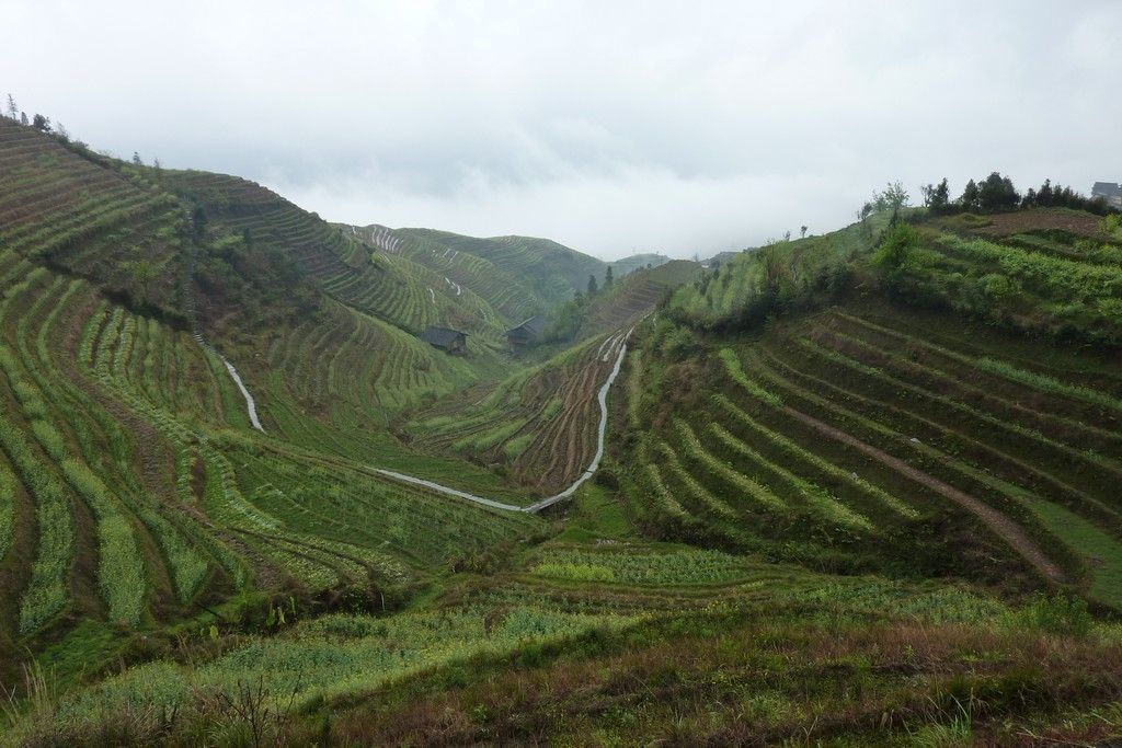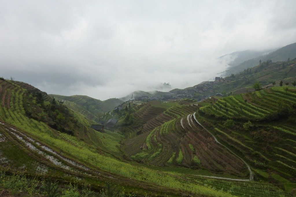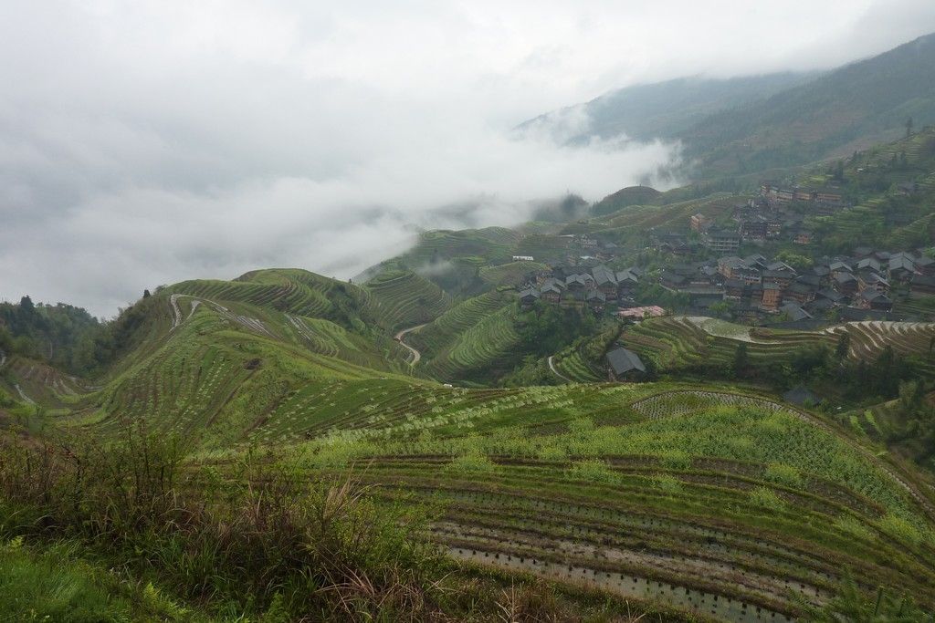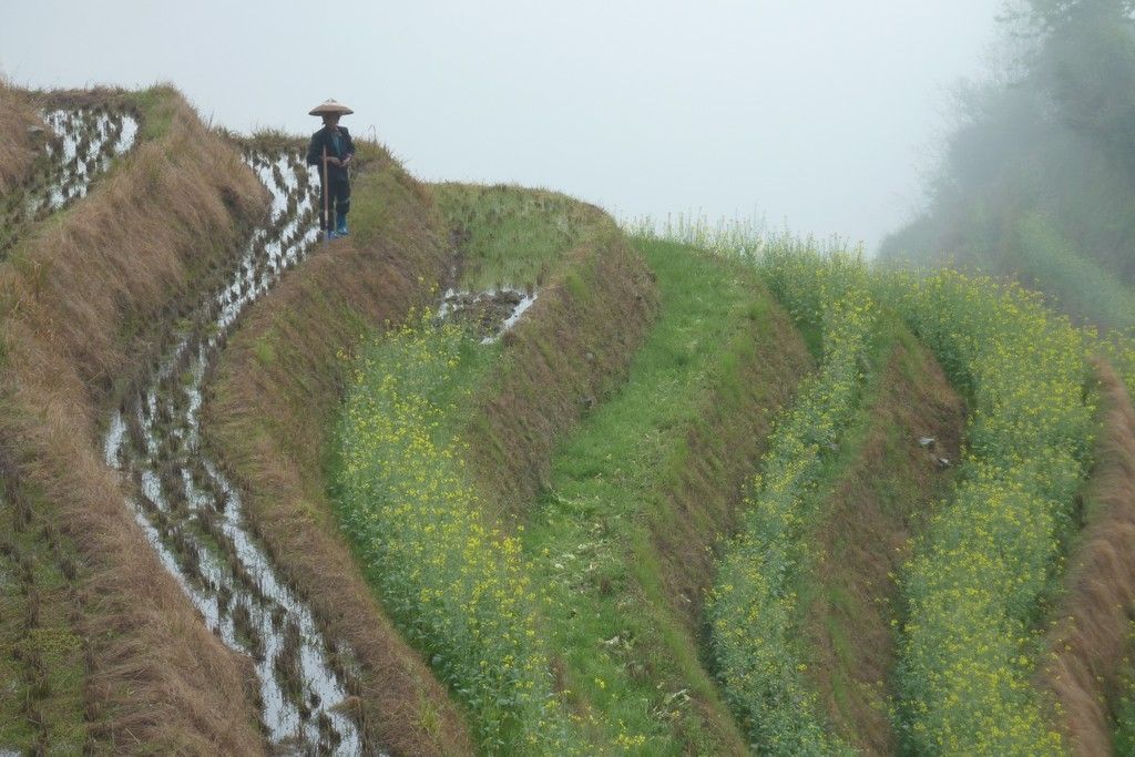 Le lendemain, après une correspondance et 3heures de bus, nous voici aux rizières de la colonne vertébrale du dragon au nord de Guillin. Ces rizières, paraît-il, impressionnantes chapeautent à plus de 1000 mètres d’altitude la montagne, donc temps nuageux souvent de mise. Évidemment avec le bol que l’on a, on est encore en train de grimper avec le bus que nous sommes déjà dans une véritable purée de pois! On ne perd pas espoir, on grimpe à pied sans voir à 10metres jusqu’au point d’observation, cool on ne voit absolument rien!!