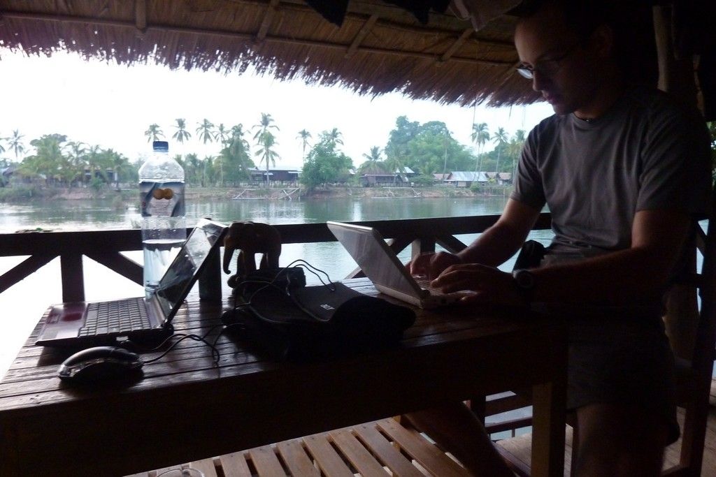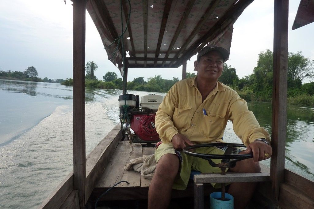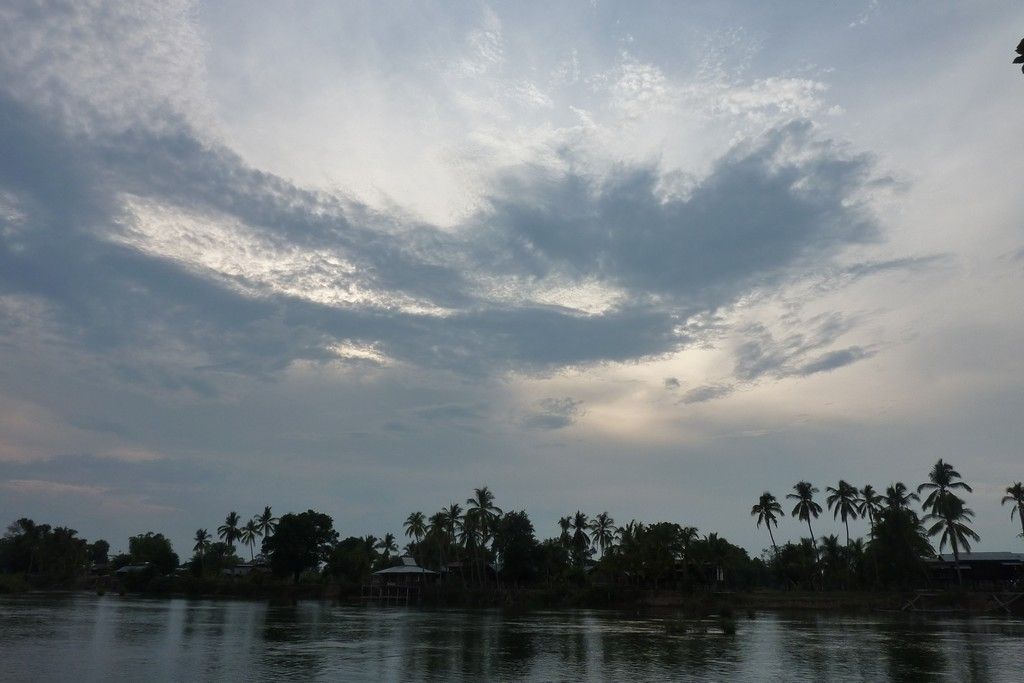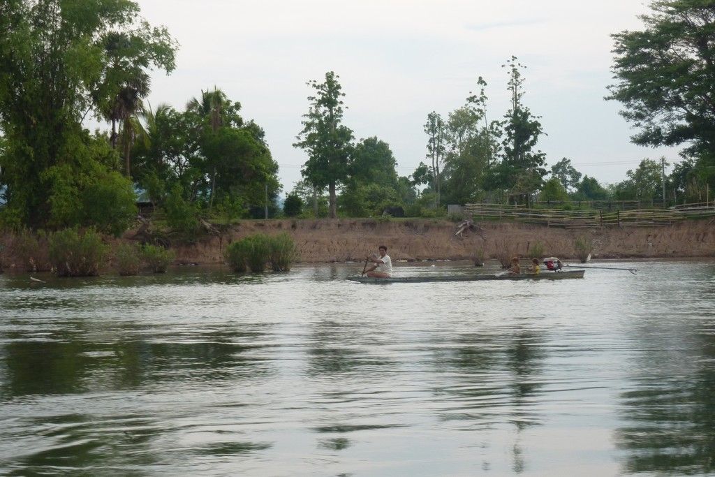 Arrivés au quai des piroguiers, j’ai perdu ma patience avec les bateliers qui ont triplé leur prix et avec le Laotien du bus qui au départ devait aller sur l’île mais au dernier moment (ça coûte plus cher si nous sommes que 2) se désiste sans fournir d’explications, ils nous prennent vraiment pour des jambons. Autant dire que j’ai hurlé en anglais! Néanmoins, nous sommes obligés de passer via leur service. Par dessus tout, ils nous déposent à 1 km du débarcadère officiel afin d’économiser l’essence!!! J’ai hésité au retour de confectionner un joli cocktail Russe appelé Molotov! J’ai ronchonné pendant un bon moment mais l’extrême sérénité des lieux m’as vite calmé!