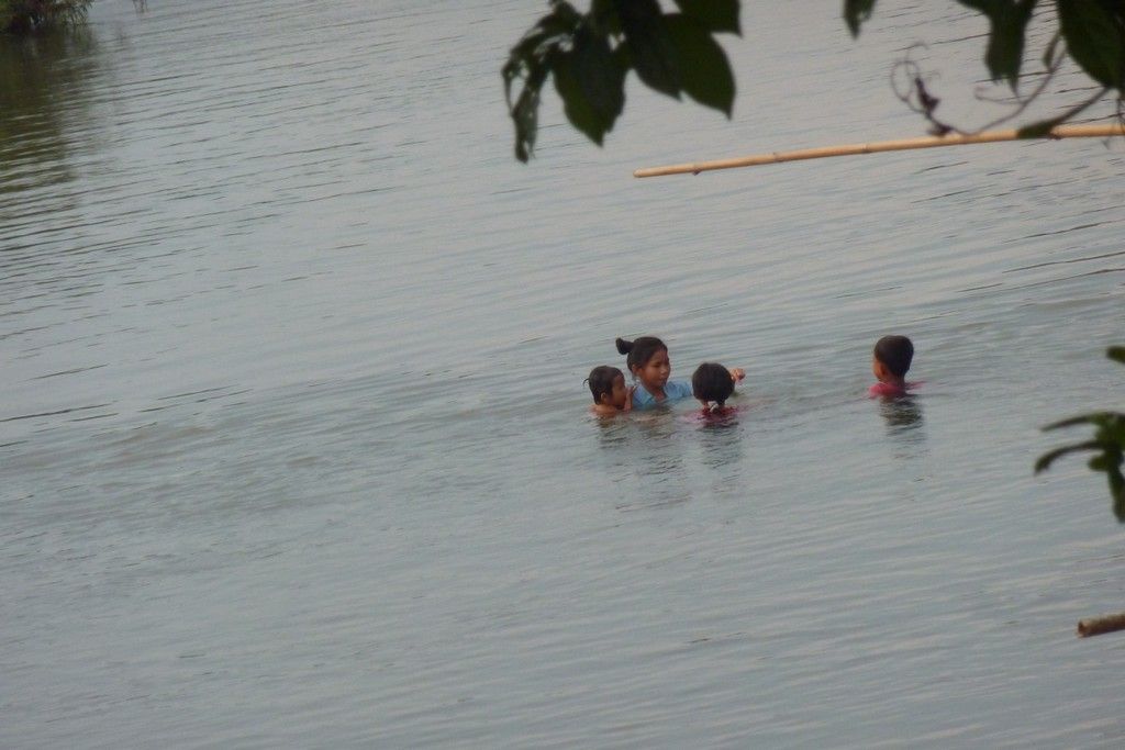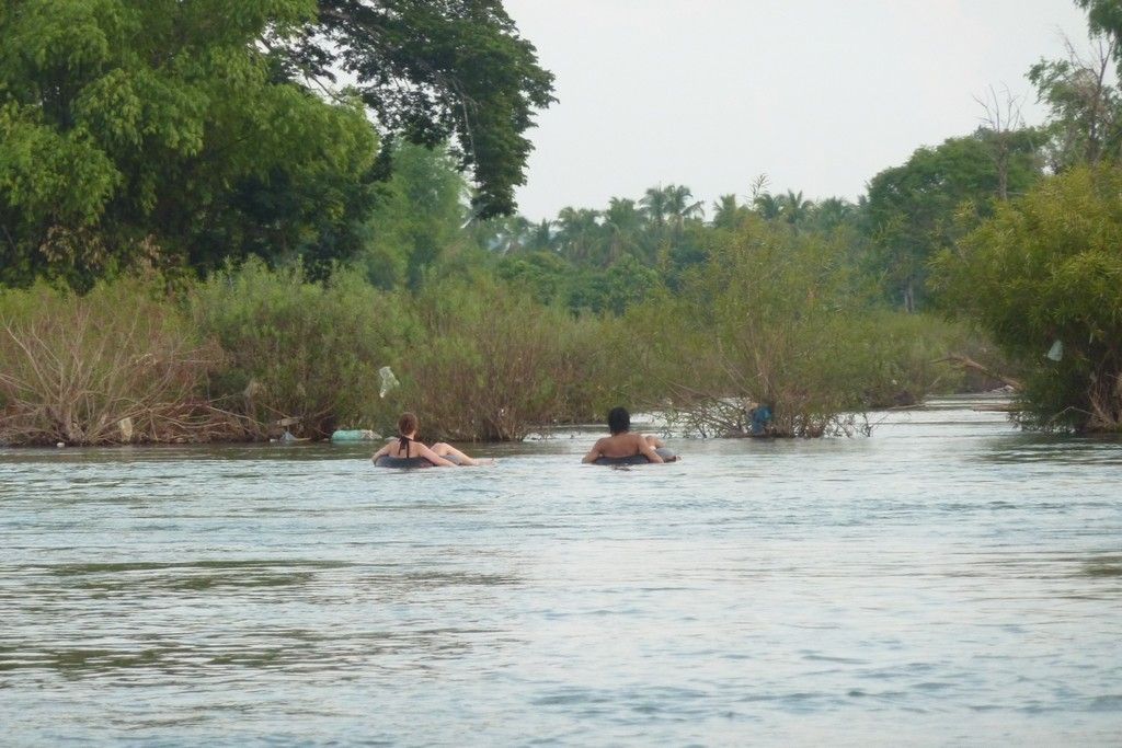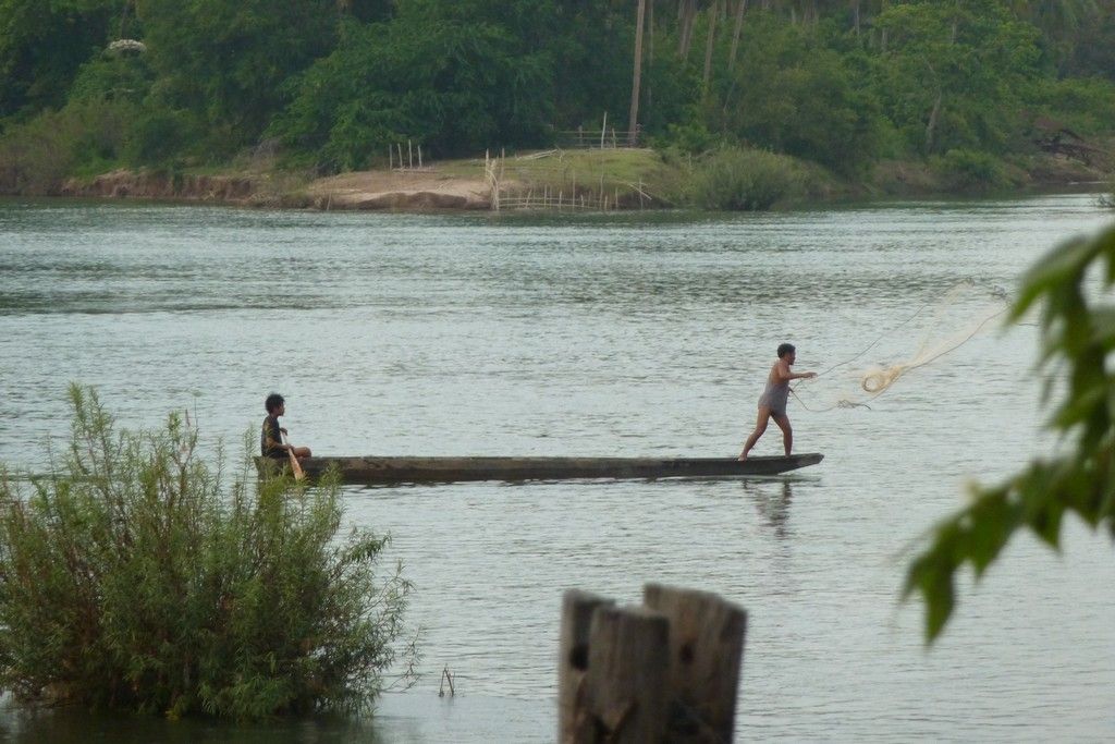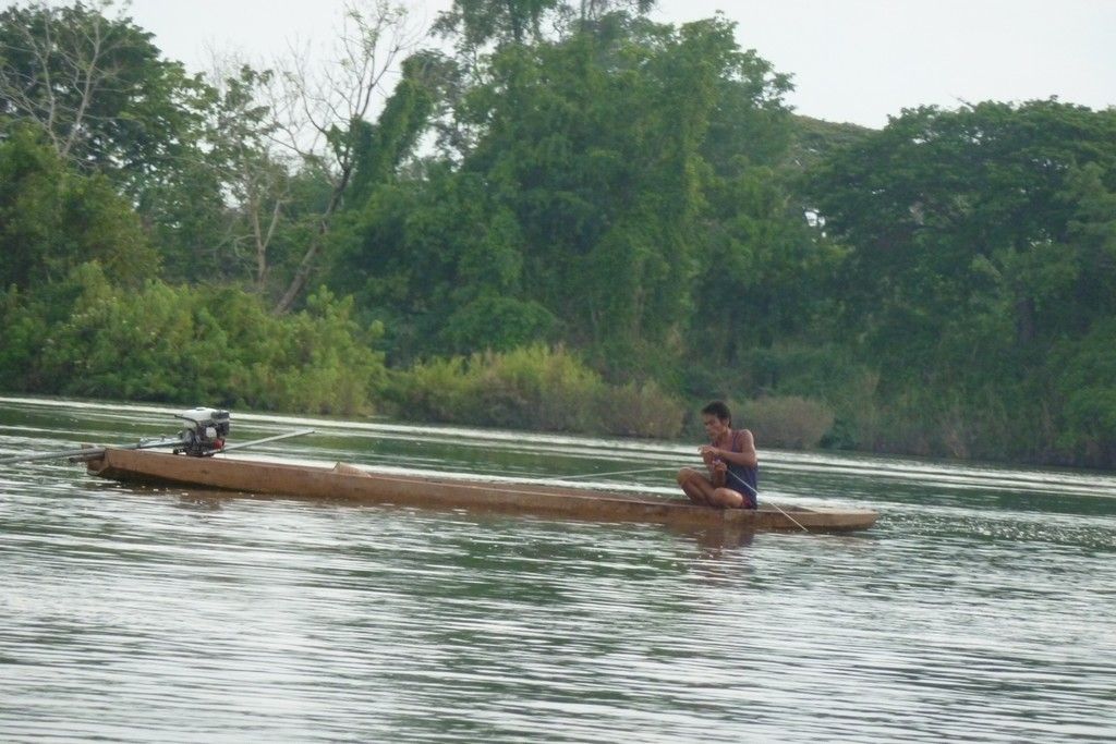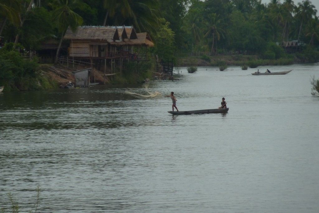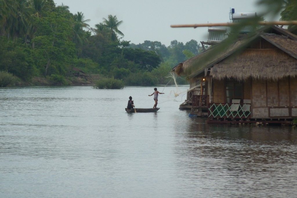L’électricité est arrivée il y a quelques mois et le ventilateur permet de passer une nuit acceptable à l’abri de la chaleur. Le bungalow est sur pilotis directement sur un bras du Mékong, aucun bruit ne trouble les lieux, le fleuve coule tranquillement, la vie s’y passe le plus simplement du monde. Les enfants jouent dans le fleuve, les femmes se lavent, les hommes pêches, quel contraste par rapport aux majestueusex chutes de Li Phi situées à quelques centaines de mètres plus loin! En cet endroit le Mékong se déverse sur 13Km de chutes impressionnantes, seule zone non navigable entre la Chine et la mer. Les Français avait d’ailleurs parié sur ce commerce fluvial en créant pont, chemin de fer et débarcadères afin de permettre le trafic d’amont en aval.